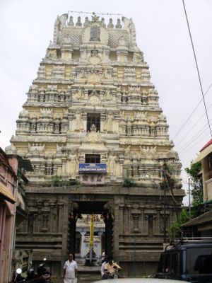 This temple features a three-tiered entrance tower, granite walls, and houses multiple shrines dedicated to Vishnu, Rama, Sita, and Hanuman.