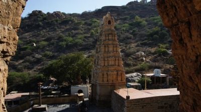 The Sri Yaganti Uma Maheswara Temple stands in a valley surrounded by hills, featuring intricate stone carvings and traditional Dravidian architecture.