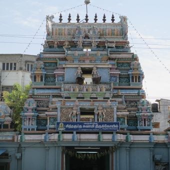 Chitragupta temple is a Hindu shrine in Kanchipuram district featuring elaborate stone carvings on walls, pillars, and facade elements that tell mythological tales. The structure follows Dravidian architectural style with characteristic towers, corridors, and sanctums arranged around a central courtyard.