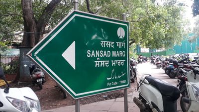 Sansad Marg connects the Parliament House to Connaught Place Circle through a wide boulevard lined with institutional buildings and green spaces.