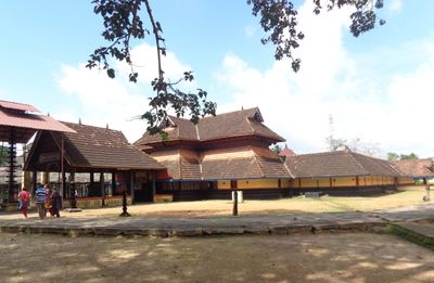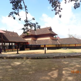 The temple stands near the Pampa river and features traditional Kerala architectural elements with intricate wooden carvings and stone work throughout its structure.