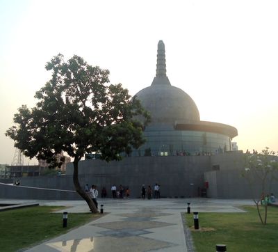 The 22-acre green space features a central 200-foot Patliputra Karuna Stupa containing Buddha's ashes, surrounded by meditation paths and lotus ponds.