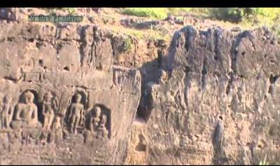 The caves display carved figures of Jain Tirthankaras such as Adinath, Shantinatha, and Parshvanatha throughout their walls. Buddhist Bodhisattva figures are also chiseled into the stone, showing how different religions shared this sacred place.