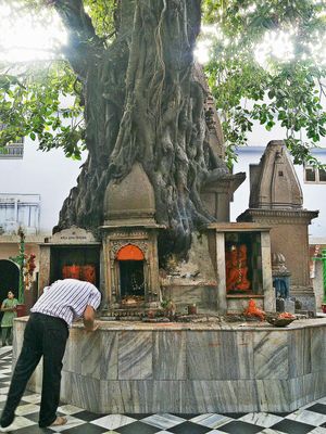 Nine planetary statues and a large lion statue guard the temple grounds, while a Banyan tree shelters the idols of Lord Ganesh and Lord Hanuman.