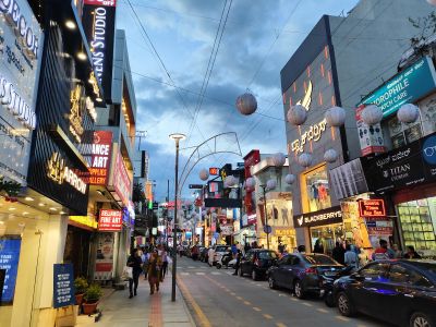 Commercial Street is a compact retail district extending through central Bengaluru with hundreds of shops selling textiles, electronics, and jewelry. The street runs as a linear shopping corridor connecting multiple commercial zones with different product categories.