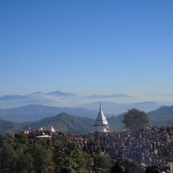 The Kalinka Temple stands at 2100 meters on a rocky hilltop, featuring a lotus-bud shaped dome and offering views of Dudhatoli hills and Trisul peaks.