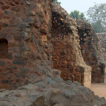 Arab Serai is a caravanserai in South East Delhi with multiple gateways and arched rooms built into its walls. The northern entrance reaches about 12 meters high and opens onto inner courtyards where these vaulted chambers once served as storage and lodging spaces.