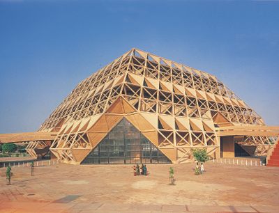 The Hall of Nations was a modernist building in the Pragati Maidan complex in New Delhi featuring interconnected concrete domes that created a vast exhibition space. The site contained four exhibition halls connected by ramps and served as a venue for international trade fairs and displays.