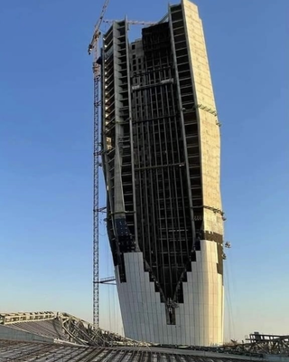 The Central Bank of Iraq Tower rises 172 meters along the Tigris River, featuring a twisting exoskeleton frame that defines its exterior structure.