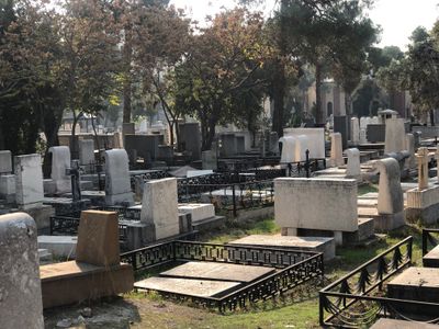 The cemetery extends across 8 hectares of land, containing different sections for Armenian, Russian, Catholic, and Assyrian Christian denominations with their distinct burial areas.