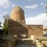 The Tomb of Esther and Mordechai is a domed mausoleum built from brick in Hamadan Province, sheltering two burial chambers with wooden coffins under glazed tile panels. A narrow bridge connects the street to the entrance, below which extends a newer vaulted space used for prayer.