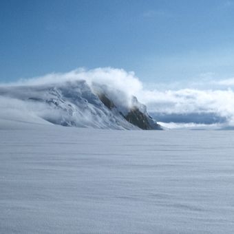 Grímsvötn is a volcano beneath the Vatnajökull ice cap in highland Iceland, sitting inside a caldera filled with glacial ice. The summit reaches around 1700 meters (5600 feet) in elevation and remains hidden under a thick ice layer that melts only during eruptions.