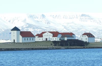 The white stone building of Bessastaðir stretches along the coastline, featuring multiple wings and a connected church on its extensive grounds.