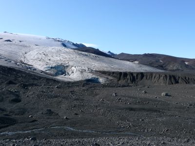 The mountain forms ice-dammed lakes called Gengissig and Galtarlón, where thermal rivers emerge from beneath the glacial surface.