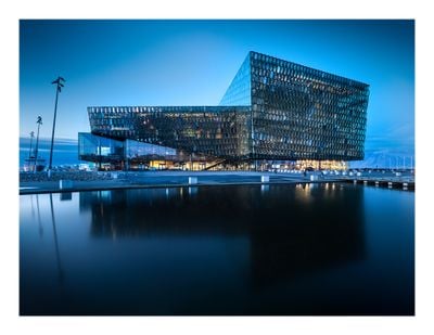 Danish-Icelandic artist Olafur Eliasson designed the glass façade to reproduce the basalt formations characteristic of Iceland, using natural light to create reflections that change according to the time of day and season.
