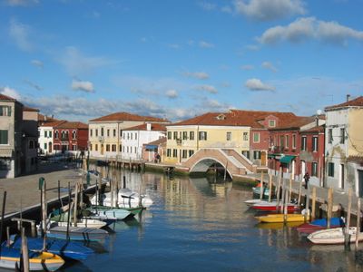 Murano consists of seven small islands connected by bridges across canals, located 1.5 kilometers north of central Venice in the Venetian Lagoon.