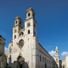 The cathedral features two tall bell towers, a trilobed portal adorned with biblical scenes, and three naves supported by columns and pillars.