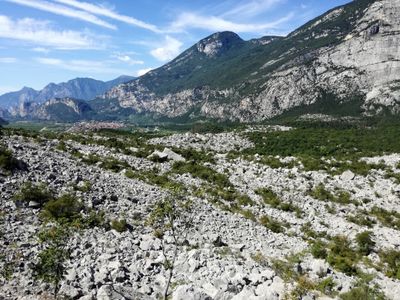 Biotopo Marocche di Dro is a nature reserve located between Lake Cavedine and Dro town, featuring vast expanses of stone fields surrounded by mountain slopes. The landscape consists of enormous rocky terrain shaped by ancient geological events.