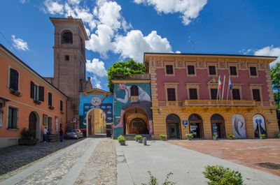 Dozza sits at an elevation of 190 meters, featuring ancient stone buildings and narrow streets that wind through its historical center point.