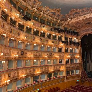 Teatro La Fenice is an opera house in Venice's San Marco district featuring neoclassical design and a horseshoe-shaped auditorium. The interior displays gilded ornamental details throughout, with five ceremonial rooms called the Sale Apollinee that accommodate around 1,244 seats arranged across multiple levels.