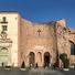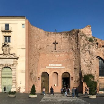 The entrance incorporates the original curved brick wall of the calidarium from the Roman baths, forming a concave facade for the building. This design connects the ancient architecture visibly with the Christian structure.