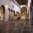 The basilica features a Romanesque bell tower, a portico with seven arches, and contains medieval choir enclosures with intricate floor mosaics and a bishop's chair.