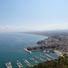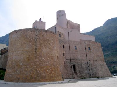 The medieval fortress stands on a rocky promontory overlooking the Mediterranean Sea, with a natural harbor at its base within the Gulf of Castellammare.
