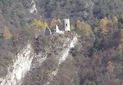 The stone fortification stands on a rocky spur between Non Valley and Adige Valley, featuring a cylindrical tower at 864 meters above sea level.