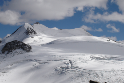 Climbers access the mountain through marked paths from Refuge ai Forni to Refuge Casati, requiring crampons and ice axes due to glacier terrain.