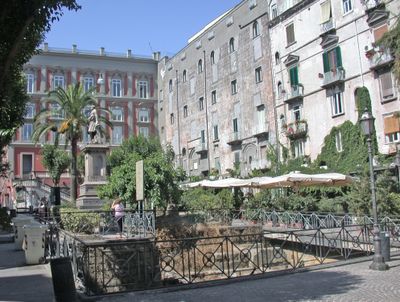 The exposed Greek ruins create a deep archaeological canyon within the square, displaying multiple layers of Neapolitan history.