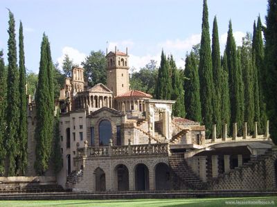 The architect Tomaso Buzzi transformed the site into his vision of an Ideal City, incorporating elements from classical architecture and surrealist art movements.