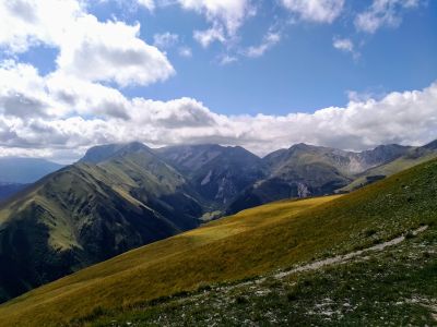 The national park spreads across a wide mountain landscape in Marche and Umbria with high summits, deep valleys, and open limestone ridges. The paths cross different elevations, from wooded slopes to bare plateaus with scree fields and small lakes.