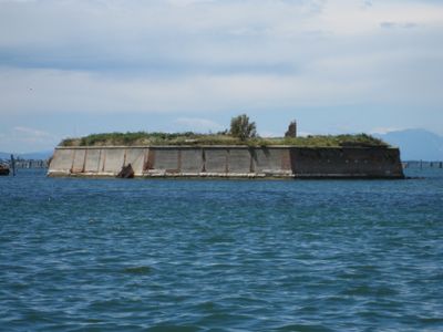 The octagonal fortification stands on a small island of 0.0020 square kilometers, constructed from rock materials in front of Ca' Roman near Pellestrina.