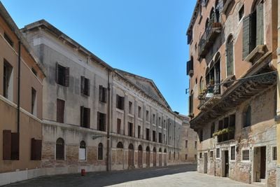 The State Archive of Venice is a former monastery with Gothic architecture that spans multiple floors near the Grand Canal and houses about 62 kilometers of shelving. The building contains numerous reading rooms and workspaces designed for examining its vast collections of documents, manuscripts, and maps.
