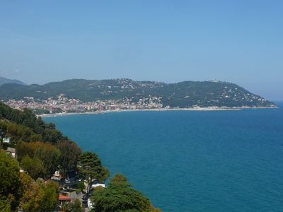The Capo Mele promontory extends into the Ligurian Sea with steep cliffs on its eastern side and a gentler slope on the western section.