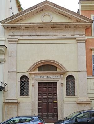 The Chiesa evangelica Battista is a neoclassical church building on Via Urbana in Rome with a balanced front facade. Two strong pilasters frame the entrance, and paired arched windows on either side create a symmetrical composition that defines its architectural character.