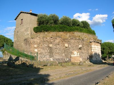 The structure exemplifies Roman burial practices, combining a monumental tomb design with functional elements such as seats for travelers along Via Appia.