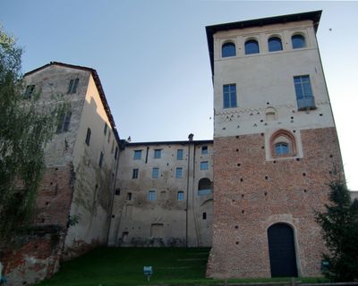 The stone castle features multiple towers, defensive walls, and Gothic architectural elements rising above the Piedmont countryside near Vercelli.