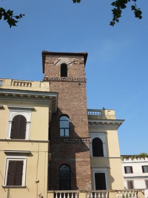 San Giacomo alla Lungara is a Romanesque church in Trastevere with thick walls and rounded arches typical of that style, positioned along Via della Lungara. The structure features a single nave and is topped by a medieval bell tower that stands out when viewed from the street.