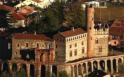 The Castello di Villar Dora stands on elevated ground, featuring Gothic architectural elements with pointed arches and fortified stone walls throughout its structure.