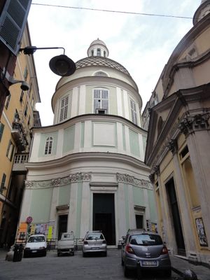 San Giorgio is a Baroque church in Genoa's Molo district, featuring an octagonal floor plan and a rounded dome as its main architectural feature. The curved facade and a tower integrated into an adjacent residential building complete its distinctive appearance.