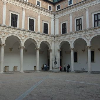 The courtyard connects multiple sections of the palace, including the grand staircase leading to the National Gallery of Marche region.