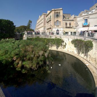 The fountain of Arethusa is a freshwater spring in Ortigia, Syracuse, Italy, that feeds a natural basin of clear water close to the Mediterranean shore. Grey mullet swim among the green papyrus stalks that grow directly from the shallow bottom.