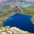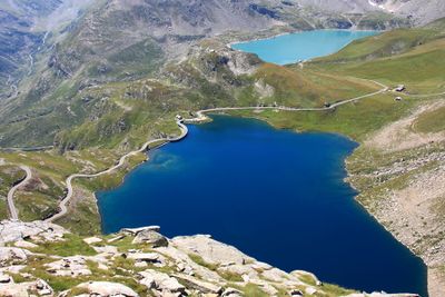 The waters of Agnel Lake display an intense blue color due to upstream sediment deposits, contrasting with the milky-gray waters of nearby Serrù Lake.