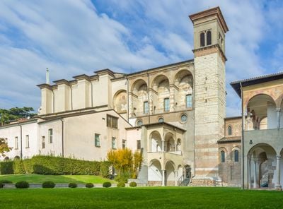 The monastery walls display frescoes from different periods, including Carolingian art and works by Paolo da Caylina and Floriano Ferramola.