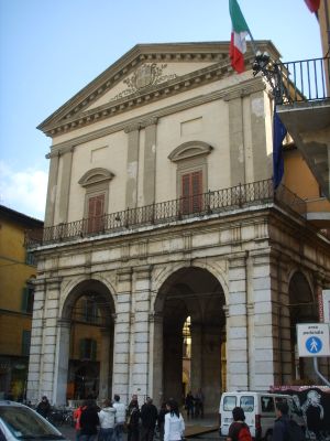 The Logge di Banchi features twelve marble pillars supporting a square base structure with an upper floor added in the eighteenth century.