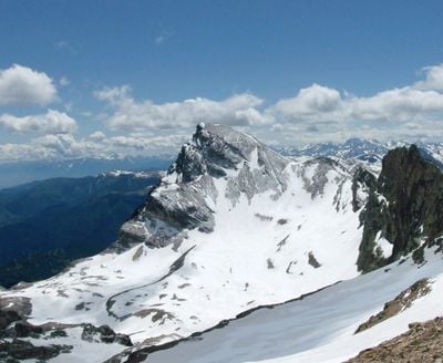 Monte Chersogno reaches an elevation of 3,026 meters in the Chambeyron Massif, featuring steep slopes and a prominent east face of quartzitic rock formations.
