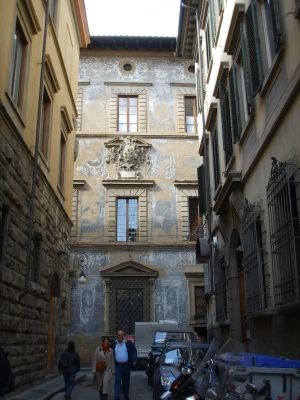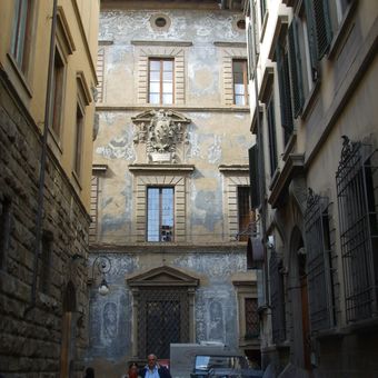 The palace features an elaborate graffiti facade designed by Giorgio Vasari, with decorative elements celebrating the Spanish courtier's life and Medici connections.