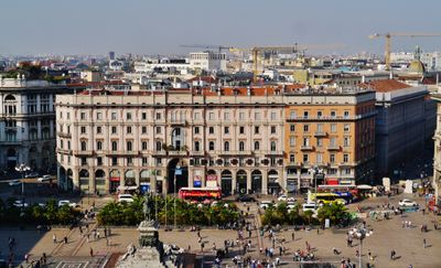 The Palazzo Carminati stands as a four-story building featuring architectural elements typical of nineteenth-century Italian design at Piazza del Duomo.