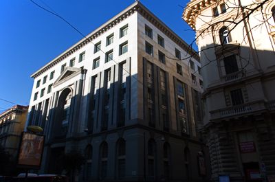 The Palazzo dei Telefoni stands at the intersection of Corso Garibaldi and Piazza Nolana with a concrete structure covered in marble and three-sectioned entrance portal.